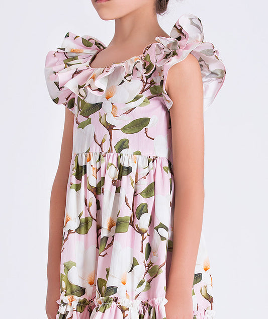 Çiçek Desenli Fırfırlı Kız Çocuk Elbisesi