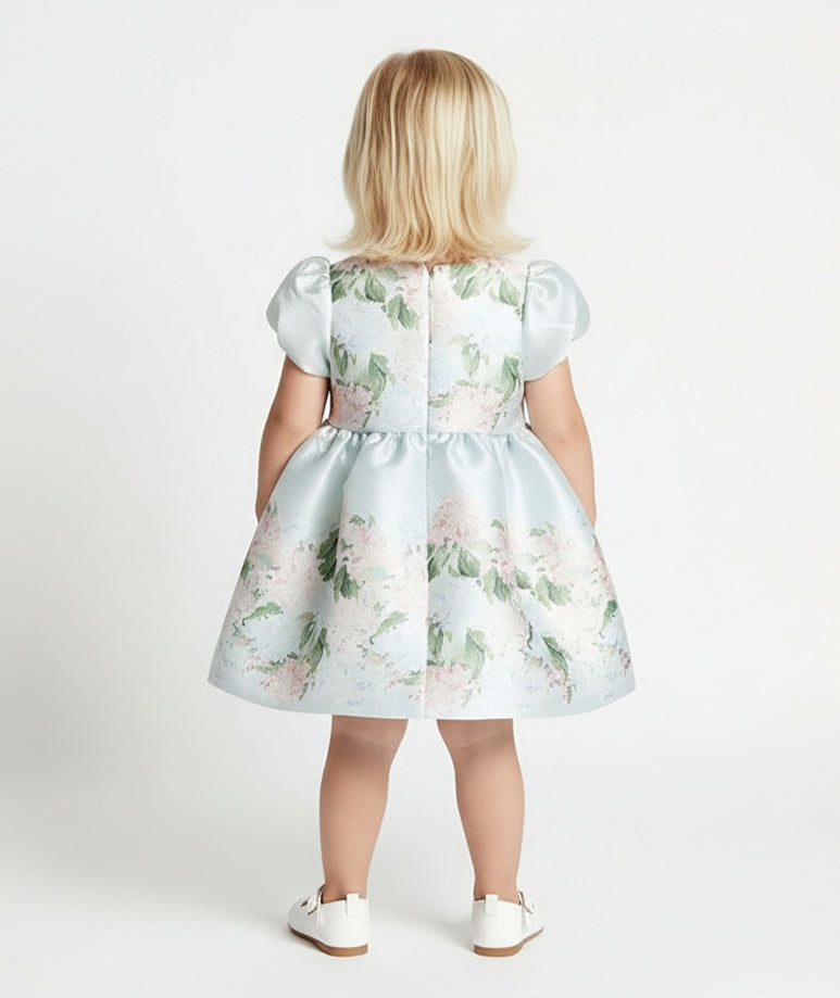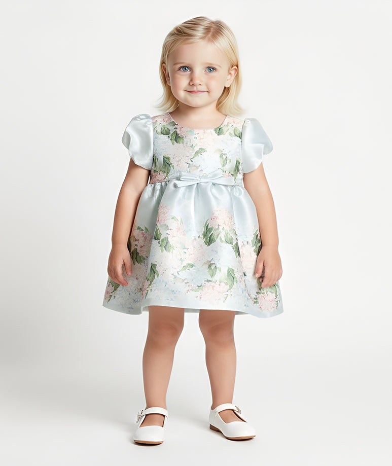 Bu zarif mavi ortanca elbisesi, pastel tonlardaki ortanca desenleri ve ipeksi parlak yüzeyiyle küçük prenseslere masalsı bir görünüm kazandırıyor. Kabarık kısa kolları, beldeki ince fiyonk detayı ve hafifçe genişleyen etek formu, elbiseye hem şıklık hem de rahatlık katıyor. Özel günler, doğum günleri, aile kutlamaları ve fotoğraf çekimleri için ideal bir seçimdir.
