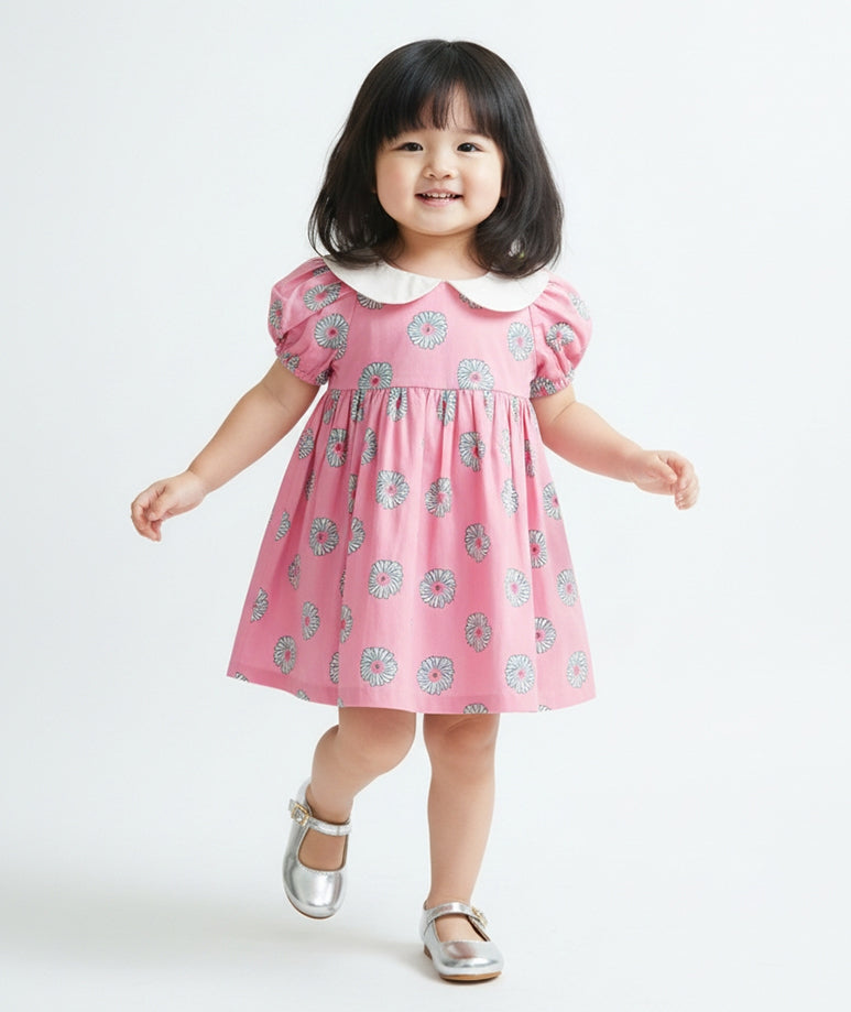 Pembe Çiçek Motifli Yakalı Bebek Elbisesi