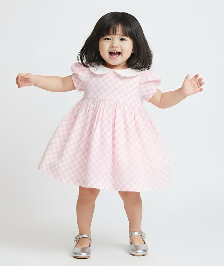 Yumuşak pembe ekose deseni ve zarif beyaz yakasıyla öne çıkan bu pamuklu bebek elbisesi, hem günlük kullanım hem de özel günler için şık ve rahat bir seçimdir. Rahat kalıbı, nefes alan kumaşı ve sevimli kabarık kollarıyla miniklere tam hareket özgürlüğü sağlar. Doğum günü kutlamaları, aile çekimleri, park gezileri ve şık davetler için ideal, zamansız ve tatlı bir stil sunar.